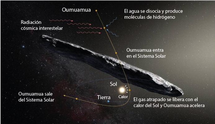 Debido a que este objeto acelera y no tenía un movimiento regular se especuló que se podría tratar de una nave espacial, muchos científicos rápidamente descartaron esta teoría y anunciaron que se trataba de un cometa inusual. Según un modelo desarrollado por Jennifer Bergner y Darryl Seligman de la Universidad de California, la aceleración de Oumuamua se debe a la liberación de hidrógeno molecular atrapado en el objeto. Este hidrógeno se forma mediante el procesamiento energético del hielo rico en agua a medida que el objeto se acerca al Sol, y luego se libera del objeto a medida que se curva ligeramente a través del Sistema Solar.